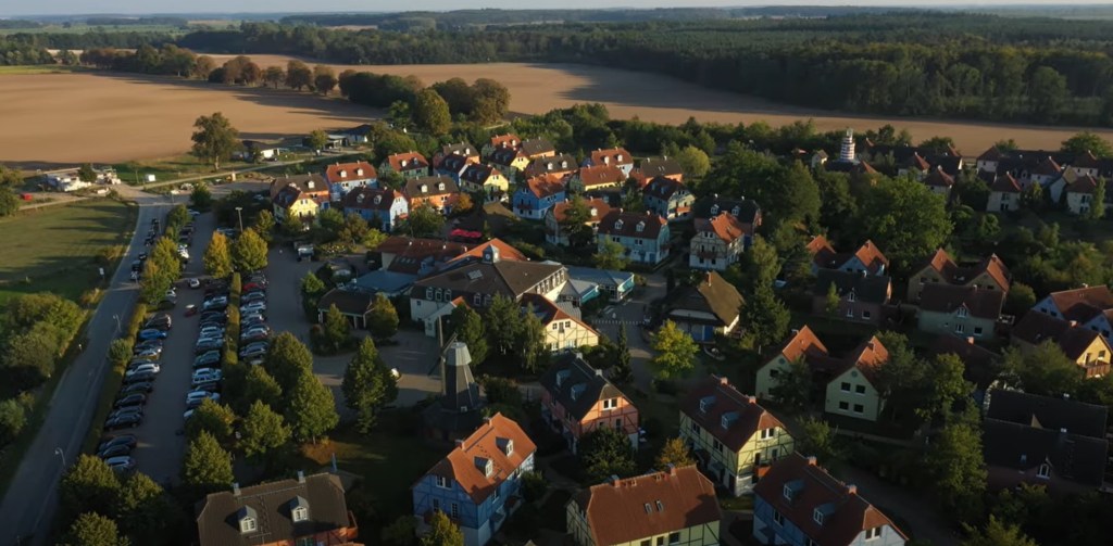 Während unserer Dreharbeiten übernachten wir auch im Dorfhotel, das – der Name sagt es schon – wie ein Dorf gebaut ist. Um einen Anger mit Teich gruppieren sich kleinere Häuser mit je zwei oder drei Ferien-Apartements.