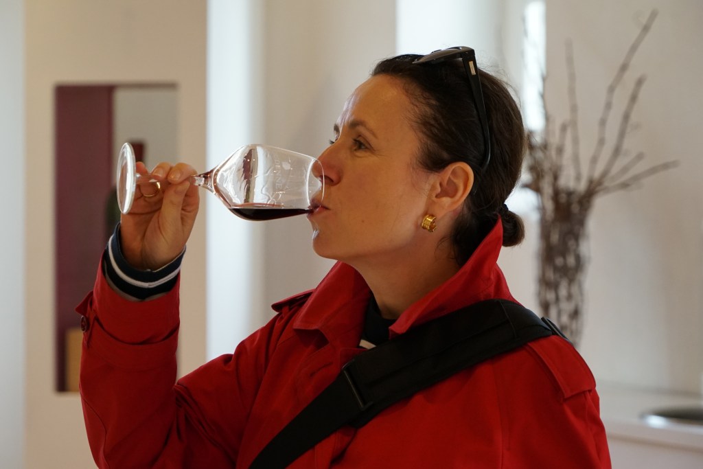 Zum guten Schluss bekommen wir ein kleines Glas Rotwein kredenzt – aus einer Flasche immerhin, die im Shop des Weinguts mit rund 500 Euro ausgezeichnet ist.