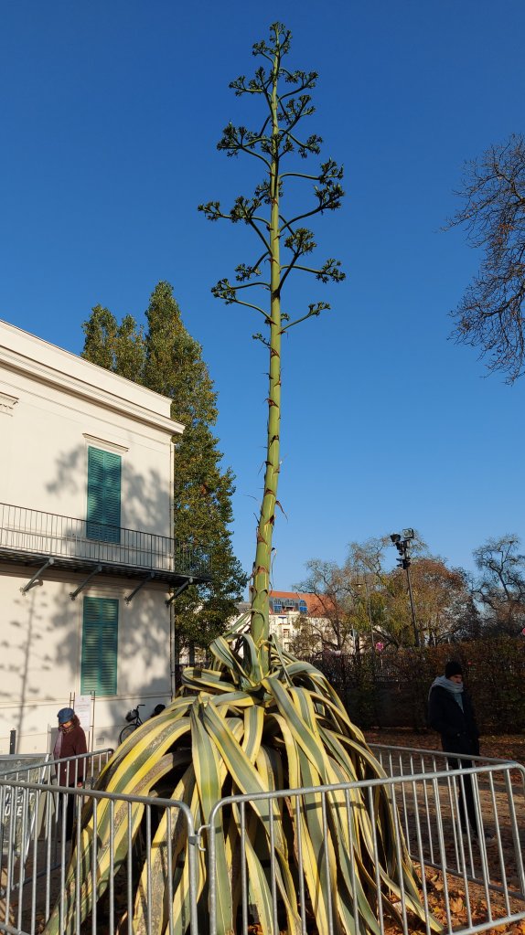 Der Blütenstand der Charlottenburger Agave ragt etwa neun Meter in den Himmel. Im Sommer hat sie ihre prächtigen Blüten präsentiert. Nun geht es auf das Ende. Mit der aufwändigen Blüte verbraucht die Pflanze all ihre Energie – und stirbt ab.