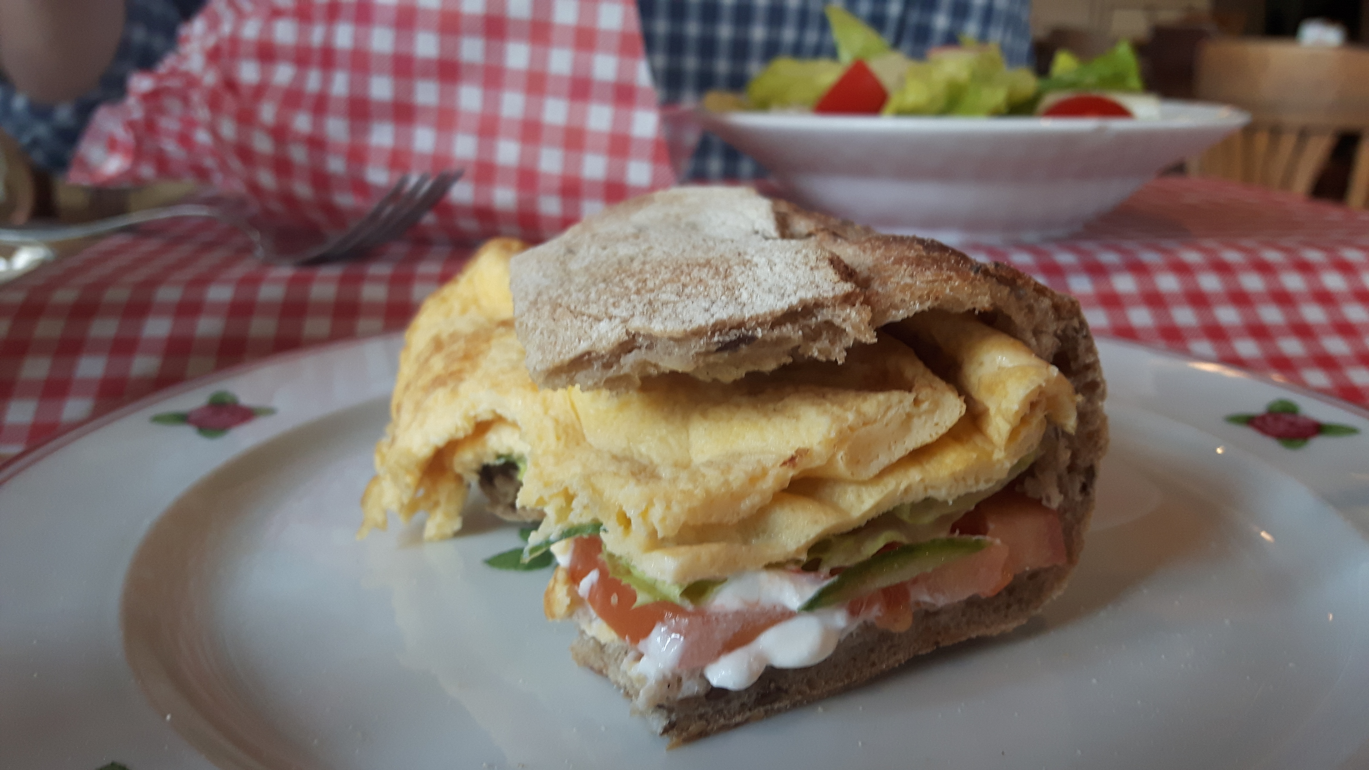 Der Gatte bestellt ein Omelette im Sandwich und ich mein Lieblingsfrühstück in Israel: Shakshuka. Versunkene Eier in einer pikanten Tomaten-Zwiebel-Paprikasoße. Sehr köstlich!