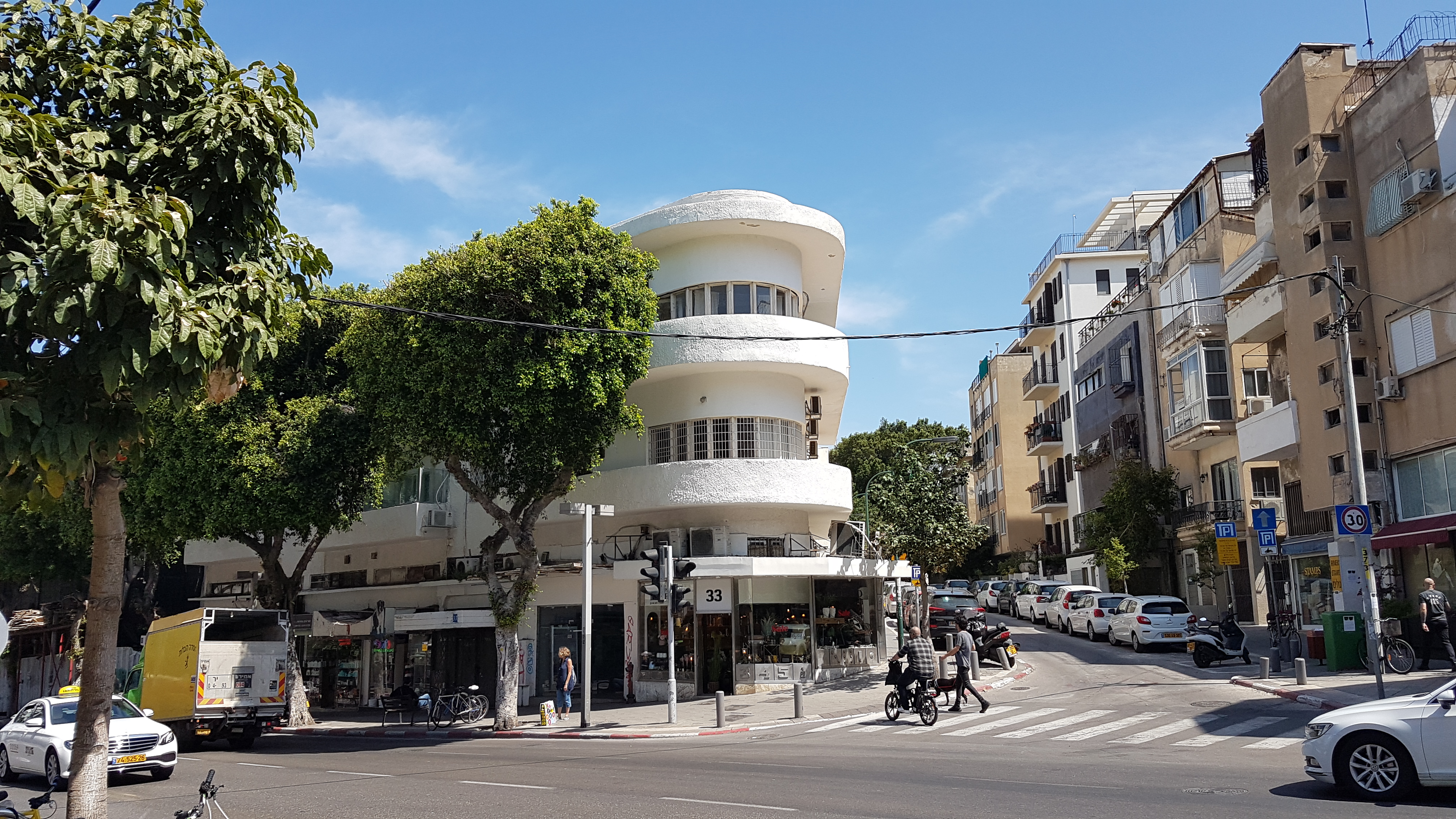 Der Zina-Dizengoff-Platz, benannt nach der Ehefrau von Tel Avis erstem Bürgermeister Meir Dizengoff, wurde Mitte der 1930er Jahre erbaut. Helle Bauhaus-Gebäude mit schön geschwungenen Linien säumen den rund angelegten Platz. Wir sind im Epizentrum der „Weißen Stadt“.