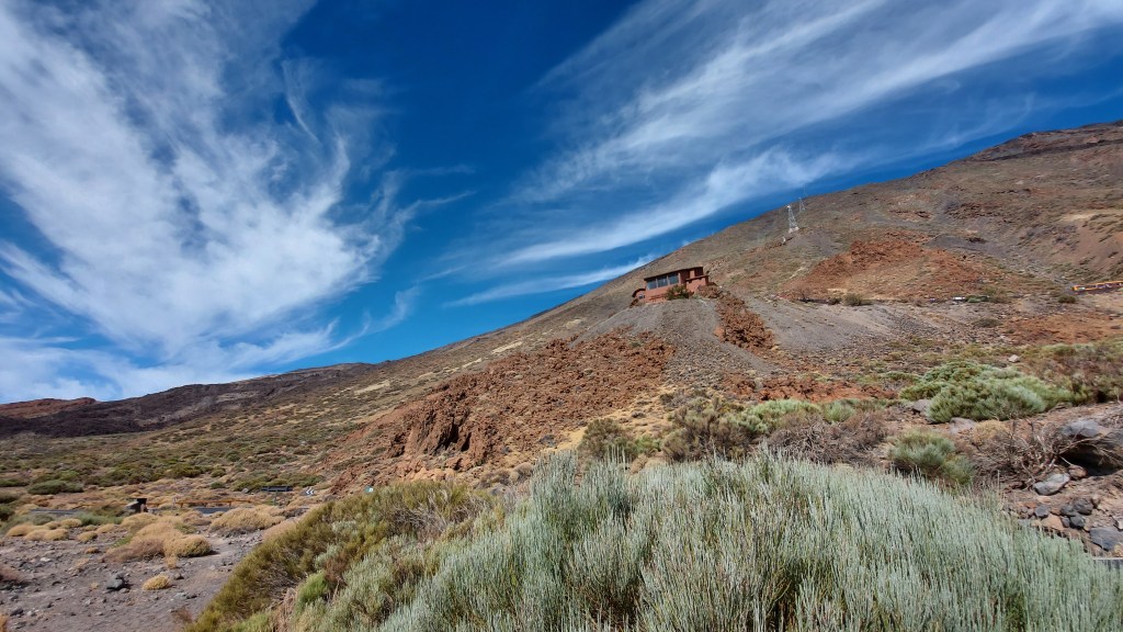 Wir wollen heute mit der Seilbahn auf den Gipfel des Teide, mit der Teléferico, die in 8 Minuten die Passagiere von der Talstation auf rund 2.300 Meter hinauf zur Gipfelstation La Rambletta bringt. 1.200 Höhemeter überwindet sie.