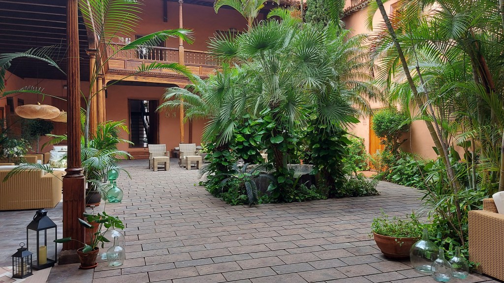 Der große „Patio“ – der Innenhof – mit üppigem Grün lädt umgehend zu „verstärktem“ Abhängen ein: Füße hoch, Weinchen trinken, plaudern, lesen!