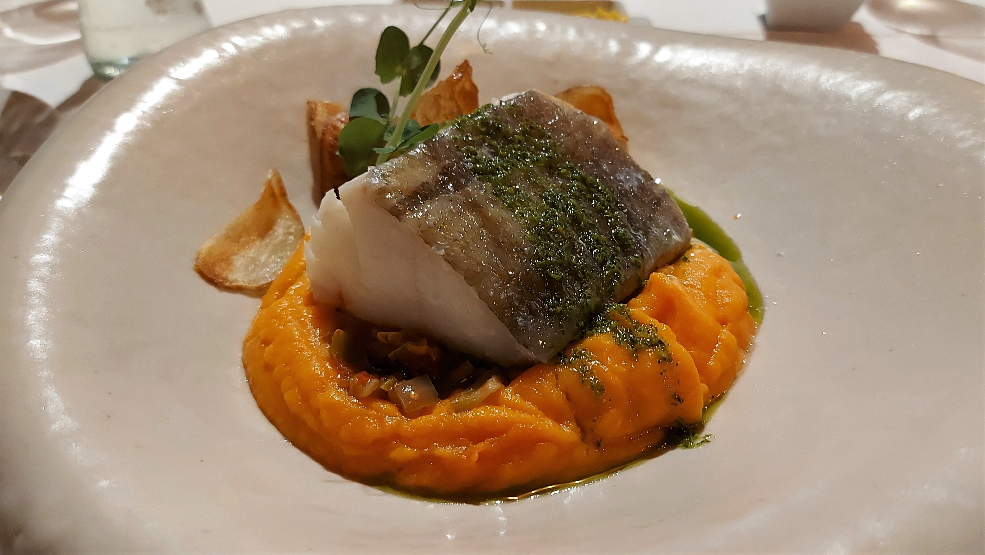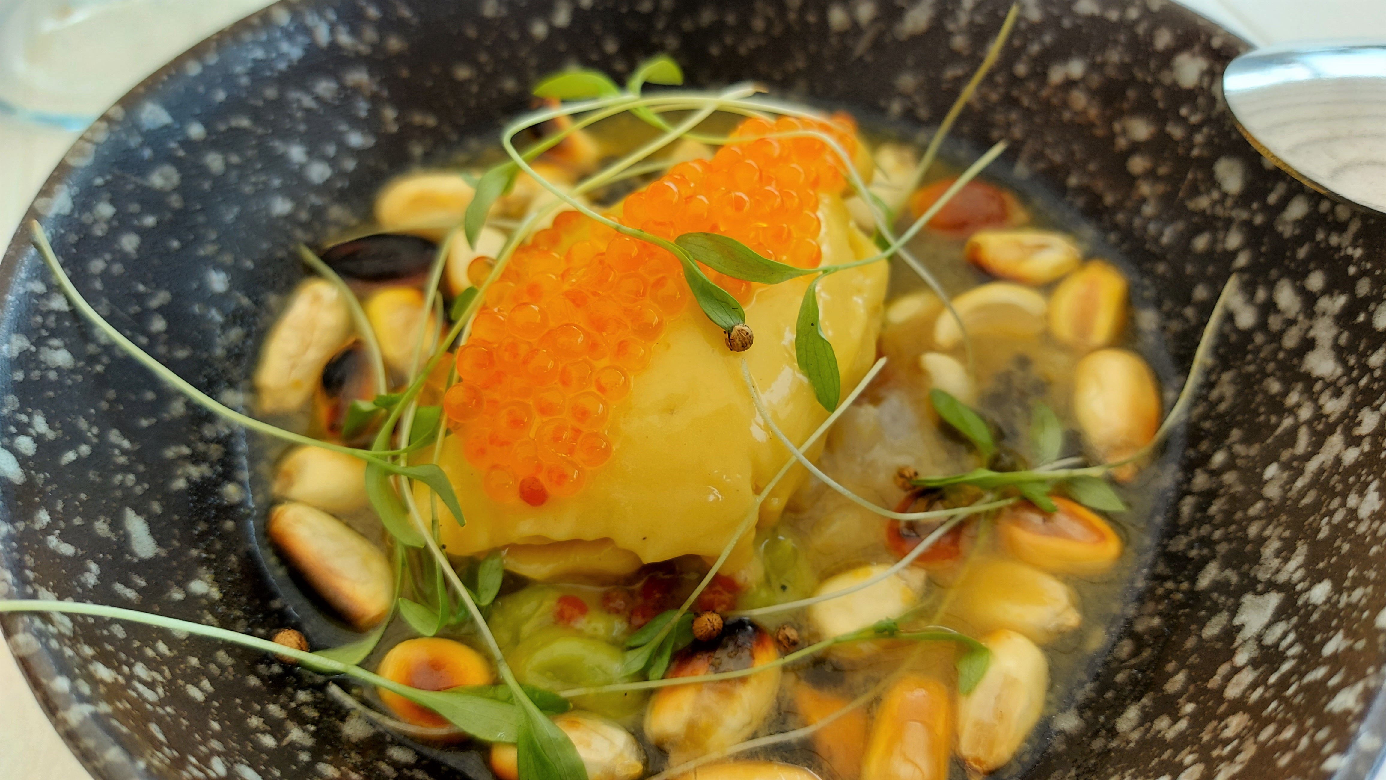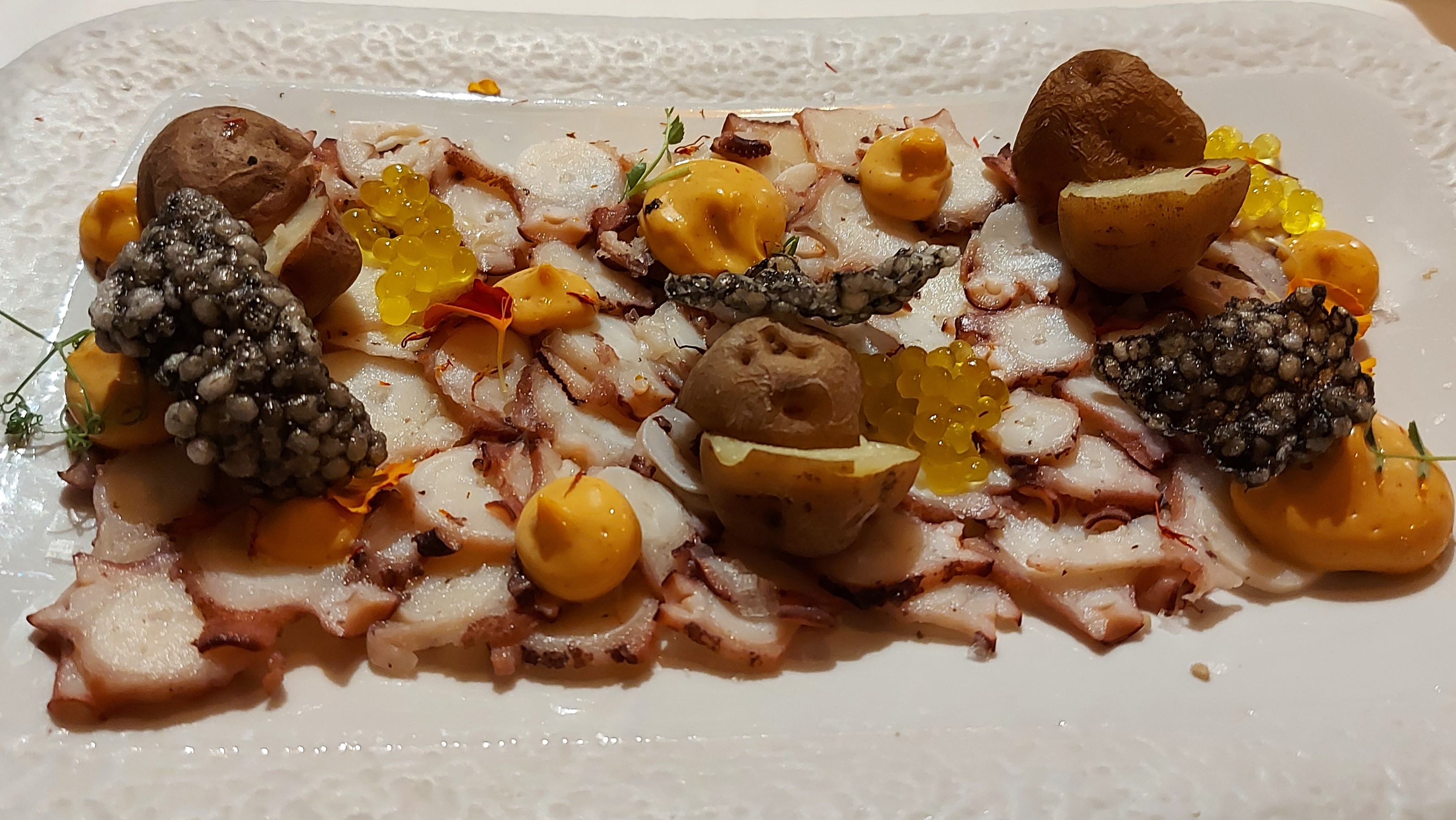 Un aperitivo en el hotel, chipirones en el restaurante, pez dem día y crema catalàn de la heladera!