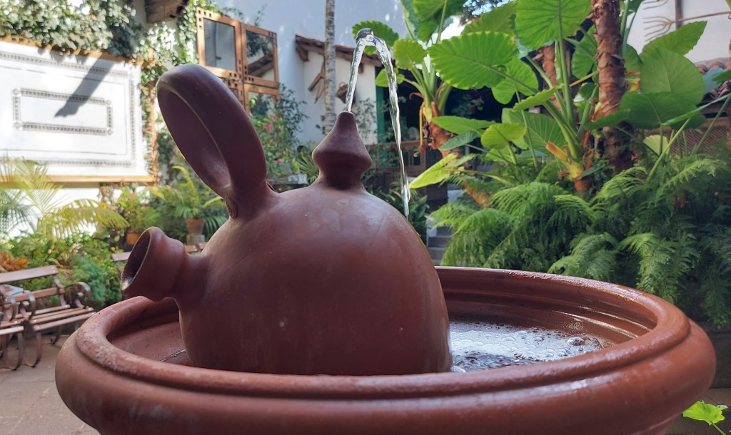 Von außen sieht die Casa streng aus und klar strukturiert. Bukolisch wird es, sobald wir in den Patio kommen, einen schönen kanarischen Innenhof: Das Licht flirrt zwischen Hell und Dunkel, riesige Alocasien und Farne wachsen in Kübeln, ein Brunnen plätschert, sanfte Kühle empfängt uns – hier haben die früheren Bewohner sicher schöne Stunden verlebt, stellen wir uns vor.