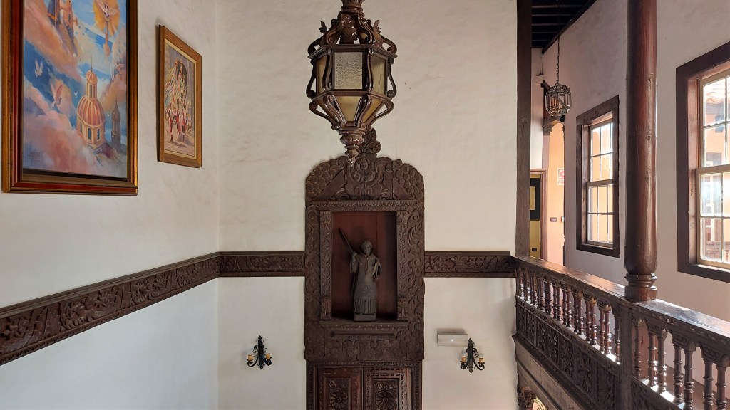 Den Abschluss des Gebäudes bildet auch im Patio eine kunstvoll geschnitzte Balkonreihe mit korinthischen Kapitellen, gefertigt von Zimmerleuten aus La Orotava, die hier zeigten, was sie drauf hatten: Eine Perle tenerifischer Handwerkskunst.