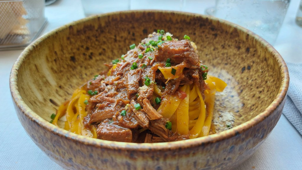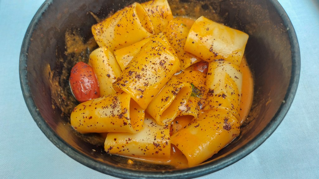 Wir nehmen im Wein-Bistro UVA Platz und genießen ein kleines, feines Mittagessen. Mit Paccheri Benedetto Cavalieri ai tre pomodori (Röhrennudeln mit einer köstlichen Soße von drei verschiedenen Tomatensorten) …