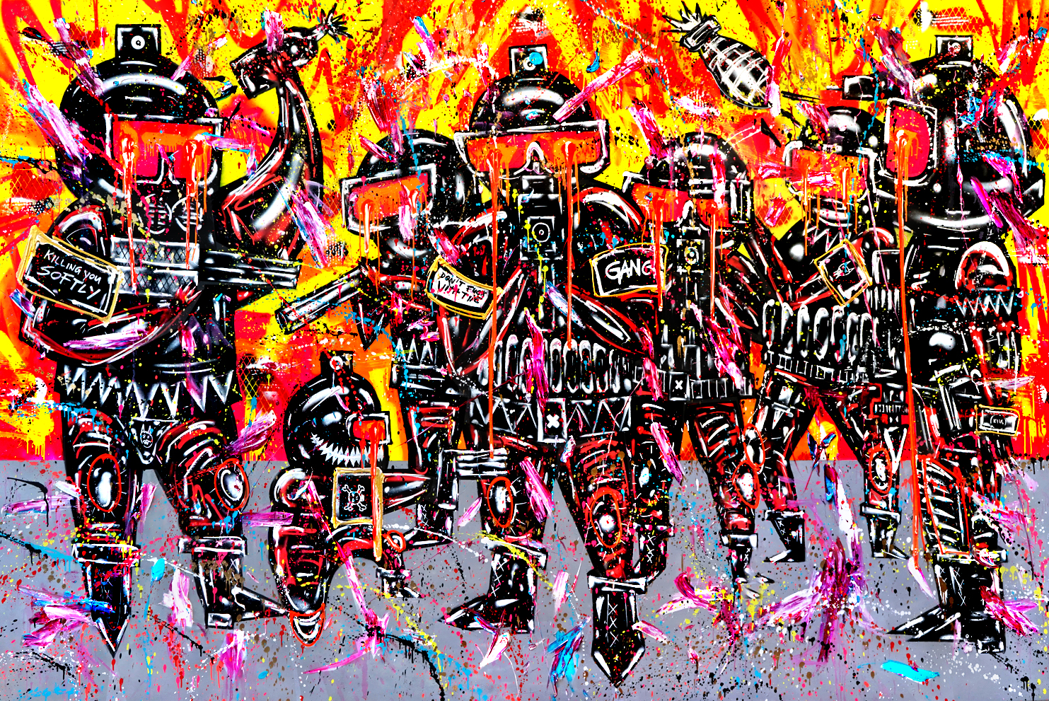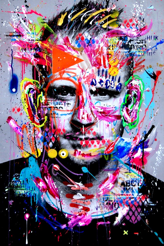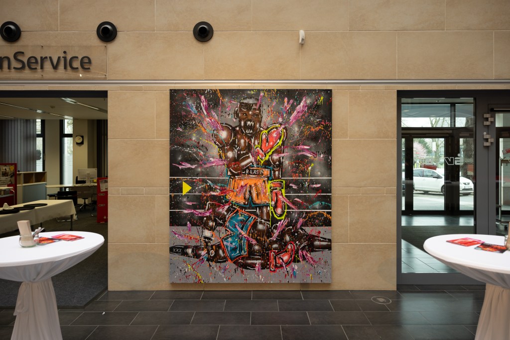 Am Anfang steht die Skizze, die Vorzeichnung, die der Künstler – ganz „old school“ – oft im Notizbuch hat oder spontan fertigt: „Dann wird das Bild umgesetzt mit der Dose, auch die Schattierung, die ganzen Hintergründe, eigentlich alles kommt aus der Sprühdose. Am Schluss erst kommen noch Spachtelelemente dazu, das ist das einzige, wo ich Öl nehme. Vorher male ich eigentlich schön und sauber und dann versuche ich, es mit Öl nochmal etwas aufzubrechen und meinen eigenen Style da reinzubringen, damit es nicht so beliebig ist. Ich will dann noch rotzige Straßenkultur reinbringen – Öl reinspachteln, damit das Schöne Risse bekommt. Am Ende umrunde ich das Ganze nochmal mit Acryl aus der Tube , um es abzusetzen von dem Hintergrund. Ganz zum Schluss kommen aus der Sprühdose letzte Elemente drauf, wirklich nur so Tropfen, als letzter Schliff, das geht dann in Richtung Action Painting.“ Fertig ist ein spannendes Bild!